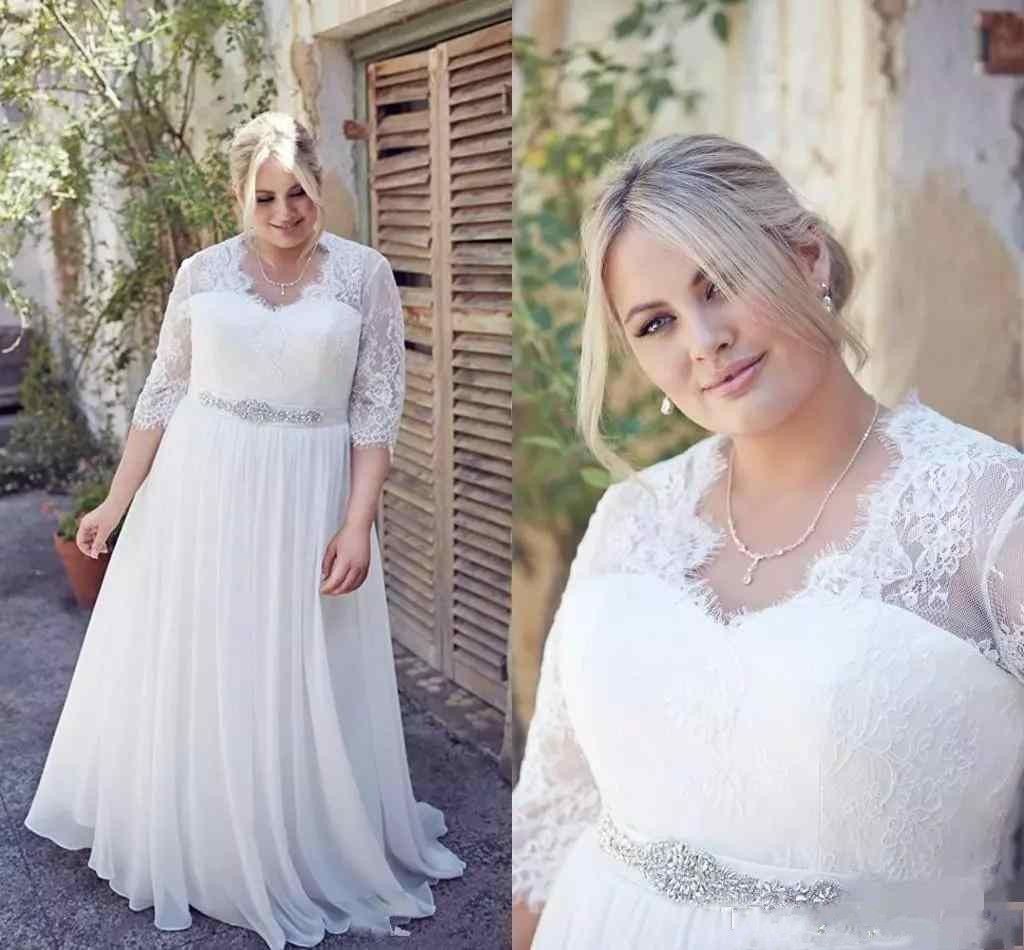 Discount 2018 Plus Size Wedding Dresses Long Sleeve V Neck A Line Lace Applique Chiffon Country Bridal Dress With Bling Belt Boho Wedding Dresses
