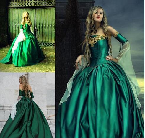 Gothic Wedding Dresses Halloween Victorian Bridal Gowns Long Sleeves Floor Length Corset Back Plus Size Satin Hunt Green Embroidery