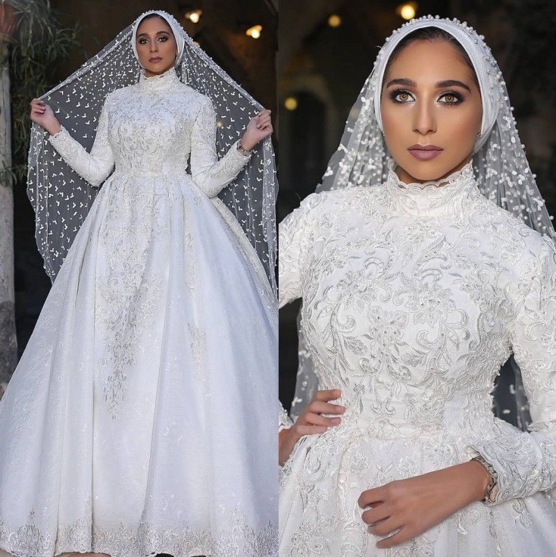 Classy Overskirt Lace Muslim Wedding Dresses Pearls High Neck Appliqued Long Sleeves Bridal Gowns A Line Sweep Train Vestido De Novia