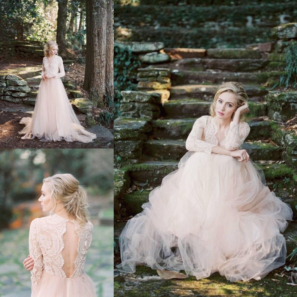 Discount 2020 Country Blush Pink Wedding Dresses Lace Appliques Long Sleeves Illusion Hollow Back Tulle Sweep Train Bohemian Plus Size Bridal Gowns