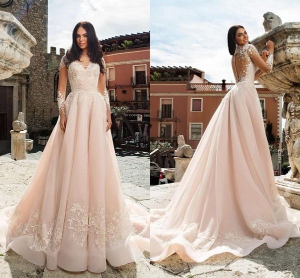 Plus Size 2019 New Country A Line Wedding Dresses V Neck Long Sleeves Lace Appliques Beaded Blush Pink Tulle Wedding Gowns Bridal Dress From Misszhu