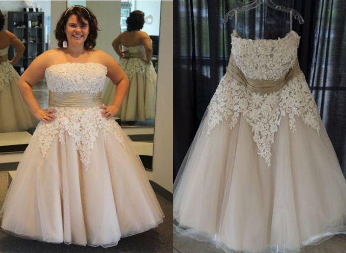 Discount Light Champagne Plus Size Wedding Dress Cheap Strapless Lace A Line Princess Tulle Applique Corset Back Tea Length Short Wedding Gowns