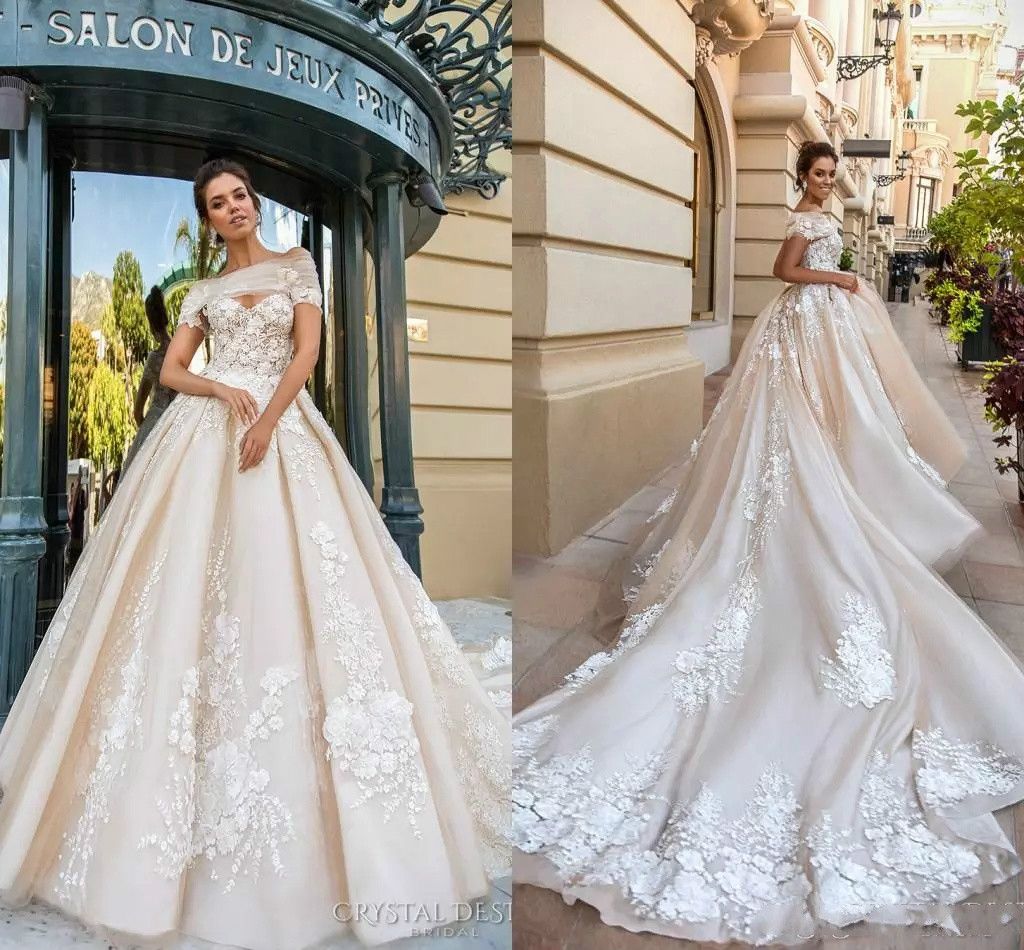 2019 Sexy Wedding Dresses Champagne Detachable Train Long Sleeves Off Shoulder Middle East Full Lace Plus Size Bridal Gowns Wedding Dresses On Sale